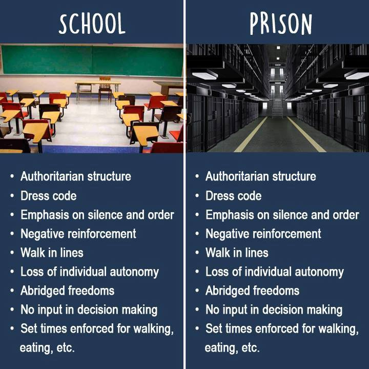 Ask any schoolchild why they don't like school and they'll tell you. "School is prison." They may not use those words, because they're too polite, or maybe they've already been brainwashed to believe that school is for their own good and therefore it can't be prison. But decipher their words and the translation generally is, "School is prison."